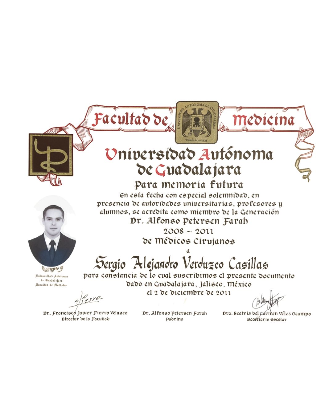Médico Cirujano por la Universidad Autónoma de Guadalajara (UAG), Jalisco, 2011.